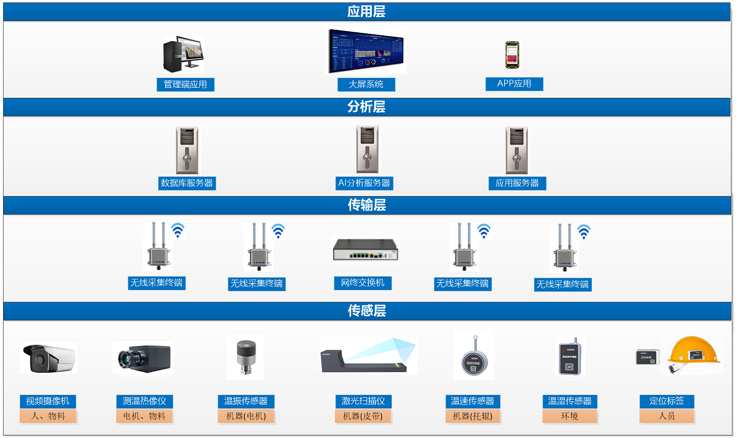 本解決方案針對(duì)當(dāng)下皮帶輸送裝置巡檢存在的痛點(diǎn),重點(diǎn)研發(fā)了面向皮帶撕裂和損傷檢測(cè)的激光掃描儀、用于托輥/滾筒狀態(tài)監(jiān)測(cè)的無線低功耗溫速傳感器、用于環(huán)境狀態(tài)監(jiān)測(cè)的無線低功耗溫濕傳感器、用于電機(jī)及減速機(jī)狀態(tài)監(jiān)測(cè)的無線低功耗溫振傳感器、用于人員定位的無線低功耗位置傳感器,并集成成熟的視頻攝像機(jī)、測(cè)溫?zé)嵯駜x,形成溫度、振動(dòng)、速度、圖像、視頻、位置六大在線感知技術(shù)融合,從而實(shí)現(xiàn)對(duì)皮帶輸送裝置安全生產(chǎn)四要素“人機(jī)料環(huán)”全面快速感知,并利用大數(shù)據(jù)、AI等技術(shù)實(shí)現(xiàn)皮帶輸送裝置全面狀態(tài)的實(shí)時(shí)監(jiān)測(cè)、多維分析及超前超警,從而保障皮帶輸送裝置高效安全運(yùn)行。